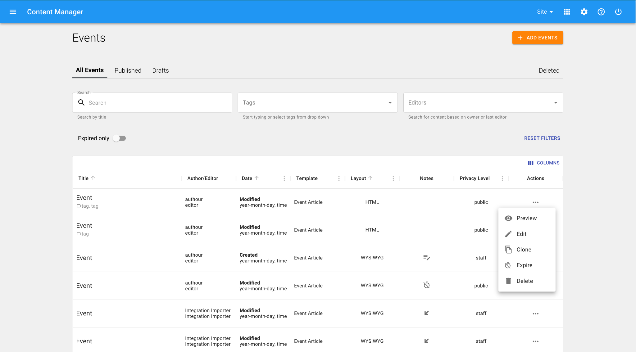 Events Manager allows a user with admin/shared permissions to: ➔ Enter the event creation process ➔ View the editable version of each calendar event on your site(s) ➔ Views can be filtered by published and drafted, as well as now being able to filter by Tags and/or Editors, and sort/filter by column ➔ Dynamically search (search as you type) for calendar events ➔ Optionally see the original author, and who has most recently updated the content ➔ Optionally see the date that the calendar event was created or most recent edit was made ➔ Optionally see the template and layout used ➔ See which calendar events are shared, expired, imported or drafted ➔ Select the action to preview, edit, clone, expire or delete each calendar event ➔ See recently deleted calendar events within a 3 month timeframe, and restore them - these will default to draft