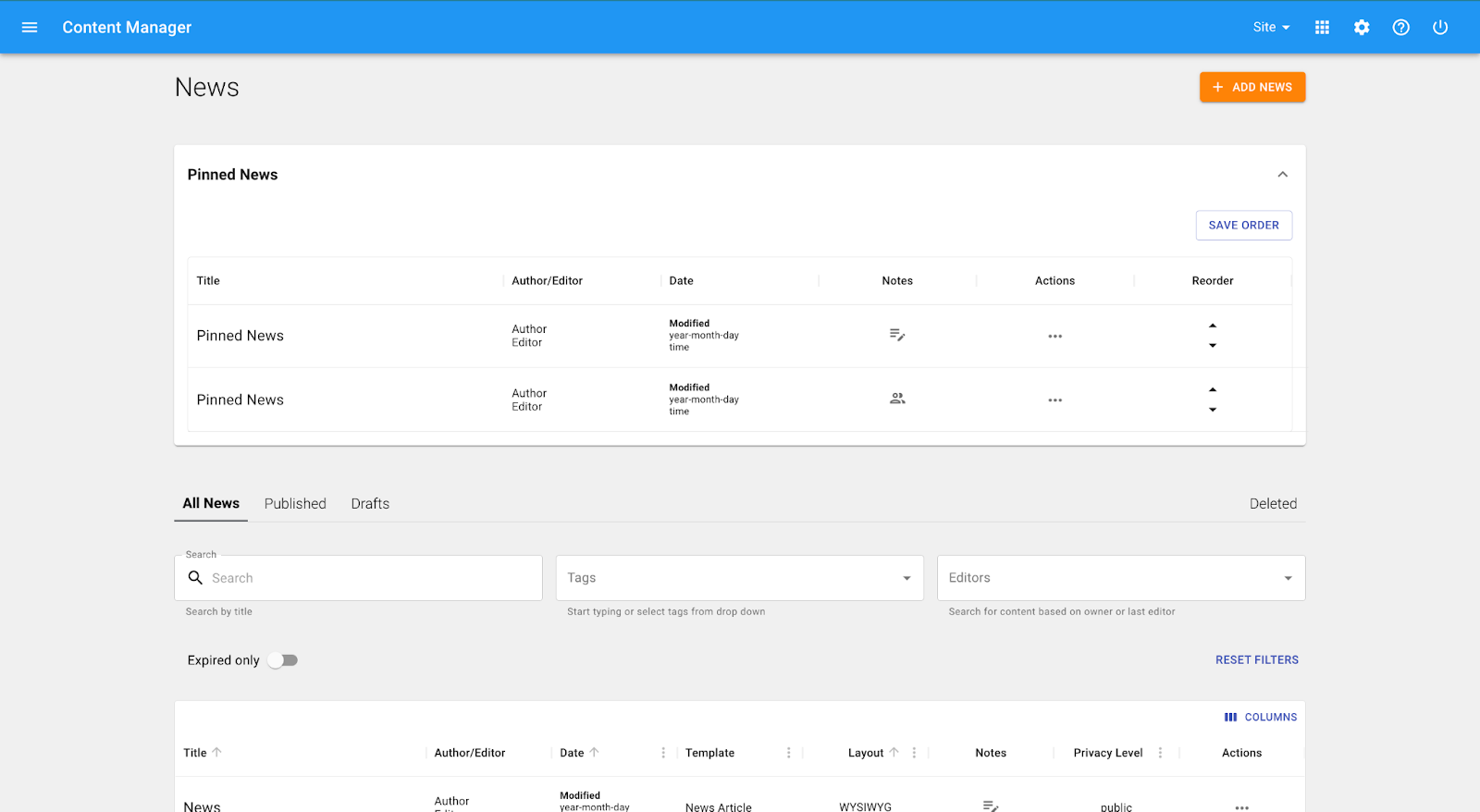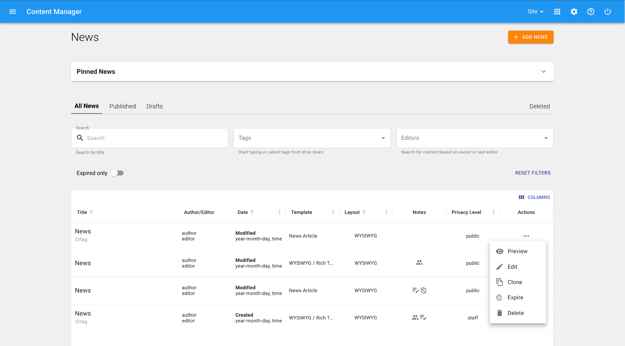 News Manager allows a user with site-only permissions to: ➔ Through the dropdown at the top of the screen, see which articles have been pinned, and reorder these (not applicable for shared news) ➔ Enter the news creation process ➔ View the editable version of each news article on your site(s) ➔ Views can be filtered by published and drafted, as well as now being able to filter by Tags and/or Editors, and sort/filter by column. See Searching, Sorting and Filtering for more information. ➔ Dynamically search (search as you type) for news articles ➔ Optionally see the original author, and who has most recently updated the content ➔ Optionally see the date that the news article was created or most recent edit was made ➔ Optionally see the template and layout used ➔ See which news articles are shared, expired, imported or drafted ➔ Select the action to preview, edit, clone, expire or delete each page ➔ See recently deleted news articles within a 3 month timeframe, and restore them (not applicable for shared news) - these will default to draft