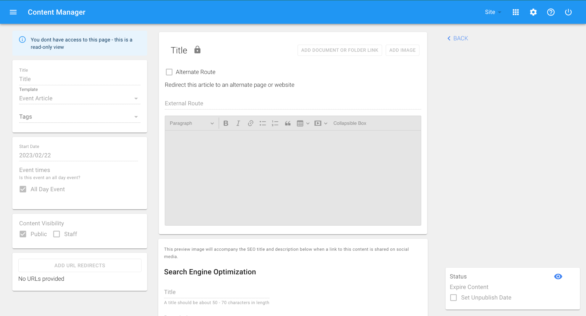 If the event you are looking to edit has this symbol in the notes column, it is a shared event. This restricts someone with site only permissions to edit any parts of the event. In the Events Manager, the ‘Edit’ option in actions will be replaced with ‘View’ and you will not be able to clone, expire or delete the event.