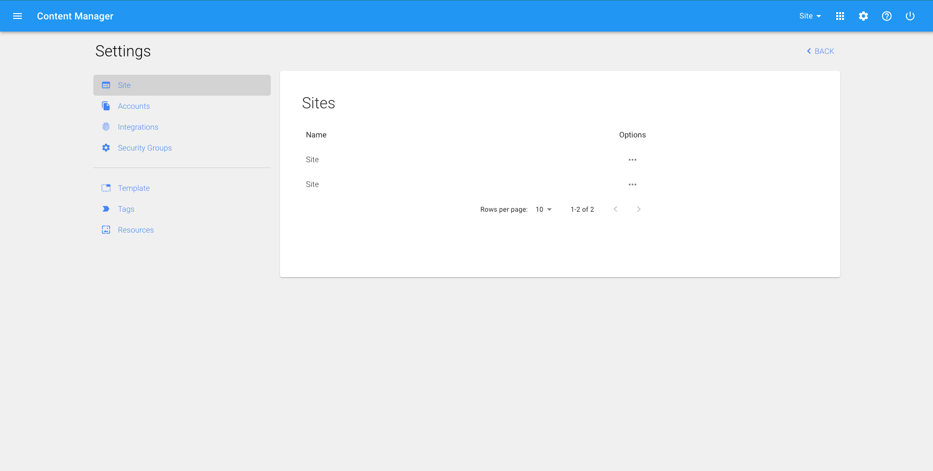 Within the Settings Manager, users with the correct permissions are able to interact with site settings, manage permissions/groups and explore back-end resources/templates.