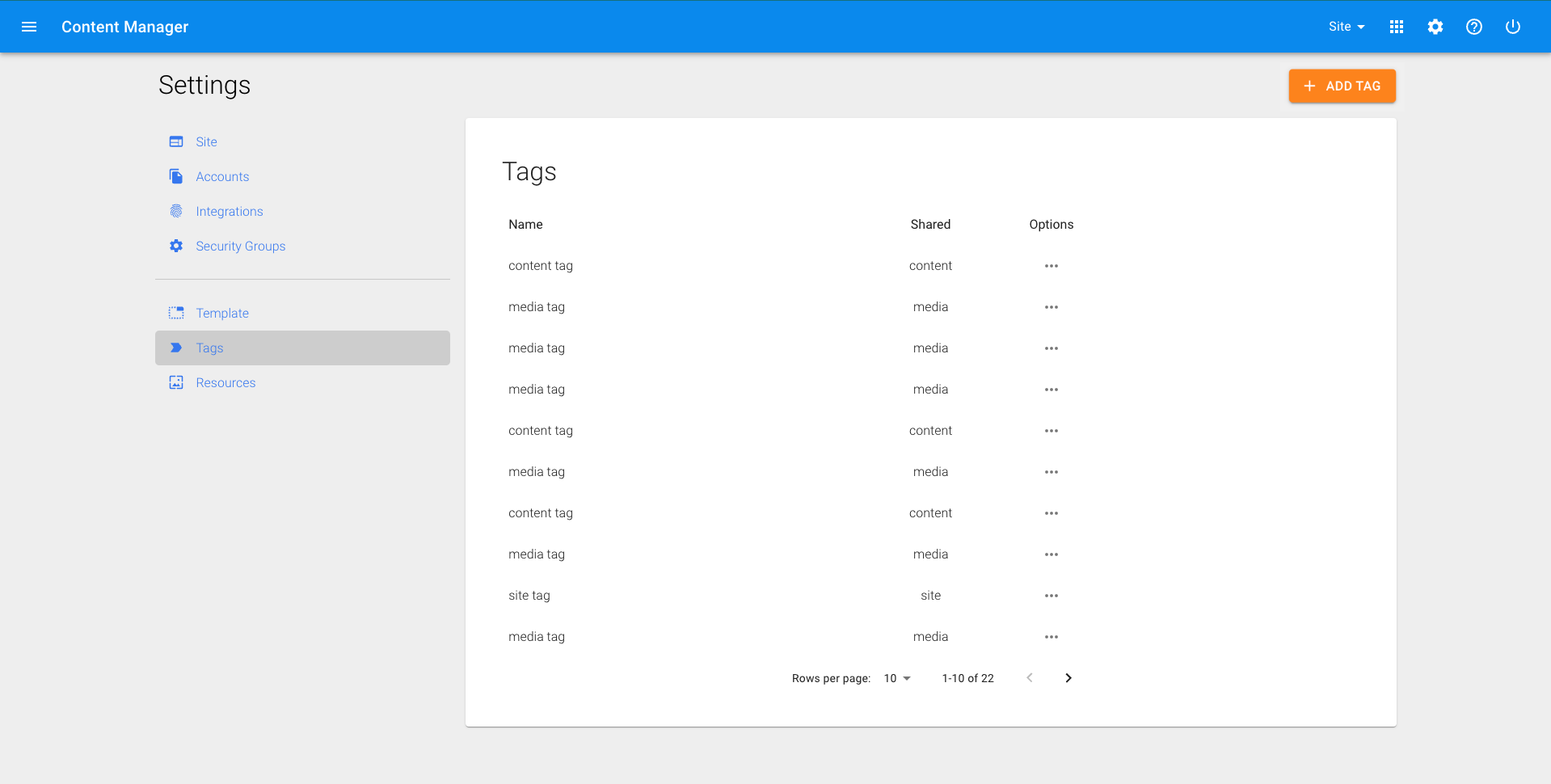1. Click on the settings icon in the top right corner of any screen 2. From the settings manager, click on 'Tags' on the left side 3. In the top right corner, click on 'ADD TAG' 4. Name your tag and select whether this is a site, media or content tag. Each has a different use case within Content Manager 5. Click 'Agree'