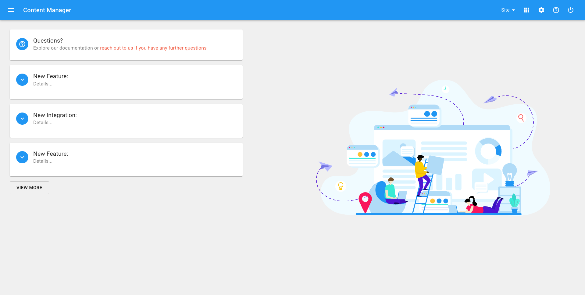 The menu bar shows on all areas of Content Manager, and allows a user to: ➔ Access all content areas through the hamburger menu in the top left corner of the screen ➔ If you have access to more that one site, change the site you are on (this becomes disabled when inside the editors) ➔ Access Settings ➔ Easily navigate to the documentation, this will adjust depending on where you are in CM
